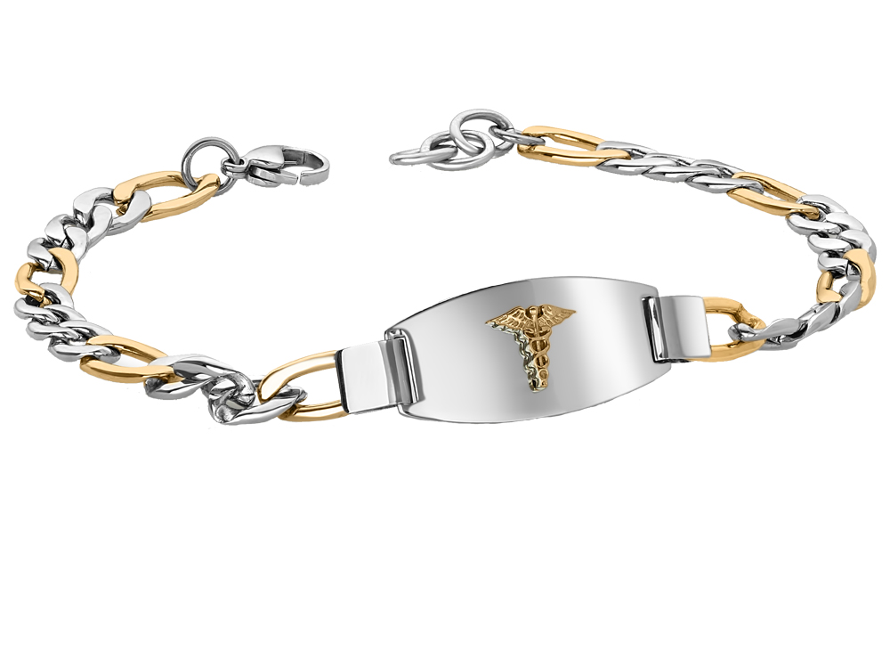 Engravable, Stainless Steel with yellow Gold Plated Accent & Links, 8.5" Long + 1/2" Extender.