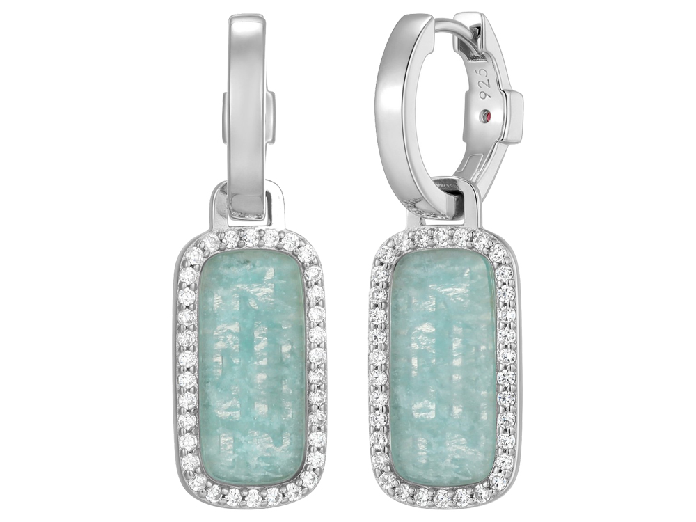 Genuine Amazonite, Cubic Zirconia Halo Accents, Drop Style on a Huggie Hoop, Rhodium Plated on Sterling Silver