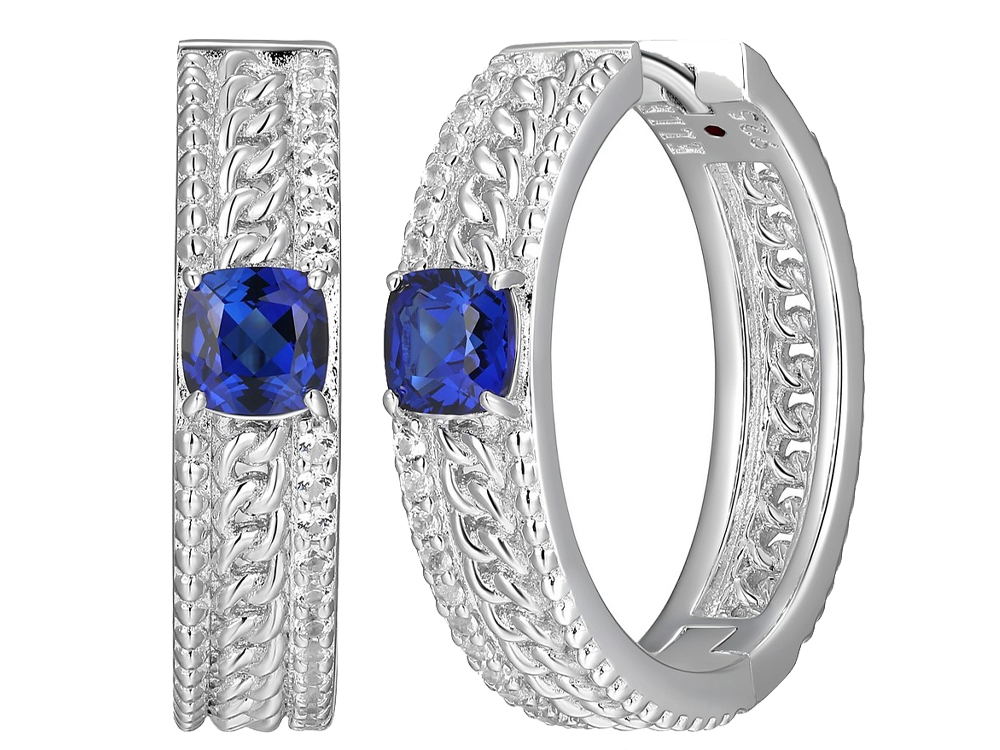 Created Blue Sapphire, Hoop, Rhodium Plated on Sterling Silver